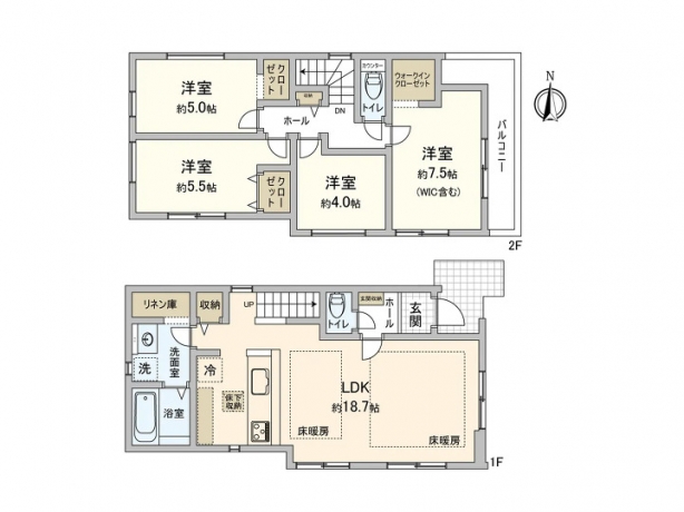 ■4LDK■カウンターキッチン■リビングイン階段■LD床暖房■収納豊富■全居室フローリング■リビング18帖■日当たり通風良好■トイレ2箇所■駐車スペース2台分■ウォークインクローゼット